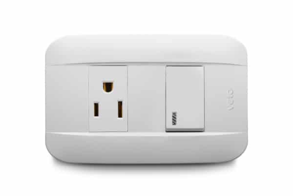 Dispositivo diseñado para compartir las funciones de un interruptor para cortar el flujo de corriente eléctrica y un tomacorriente usado para establecer una conexión eléctrica, en una sola placa.
